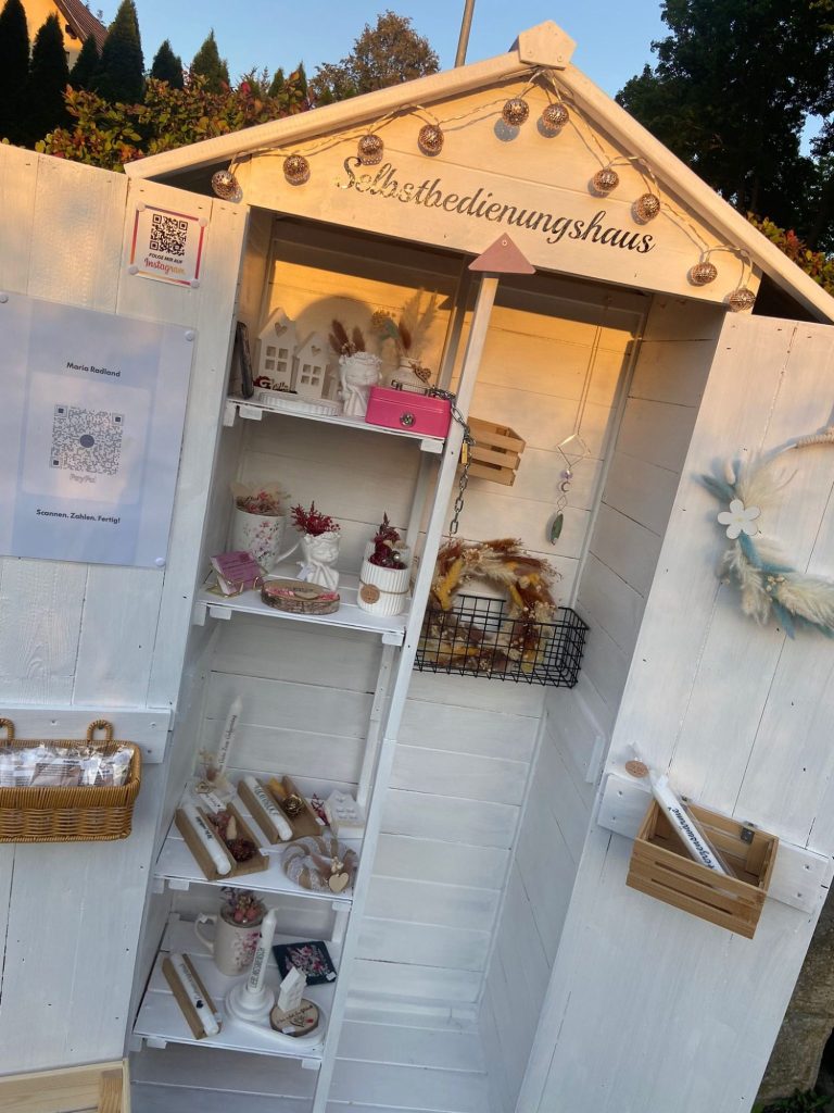 In meinem Selbstbedienungs-häuschen habt ihr rund um die Uhr, an jedem Wochen- und Feiertag die Möglichkeit, ganz bequem & flexibel einzukaufen. Mit einem einfachen Öffnen der Schranktüren könnt ihr auf viele liebevoll handgemachten Artikel zugreifen, die für euch bereitstehen. An den Artikeln hängen oder kleben kleine Preisschildchen. Ihr müsst nur noch eure Artikelpreise zusammenrechnen & in bar oder per Paypal bezahlen.