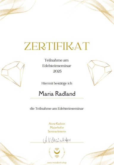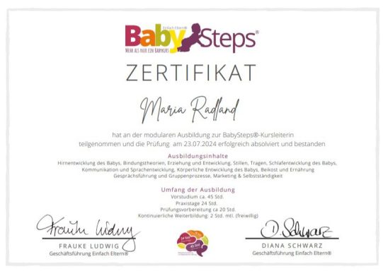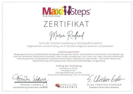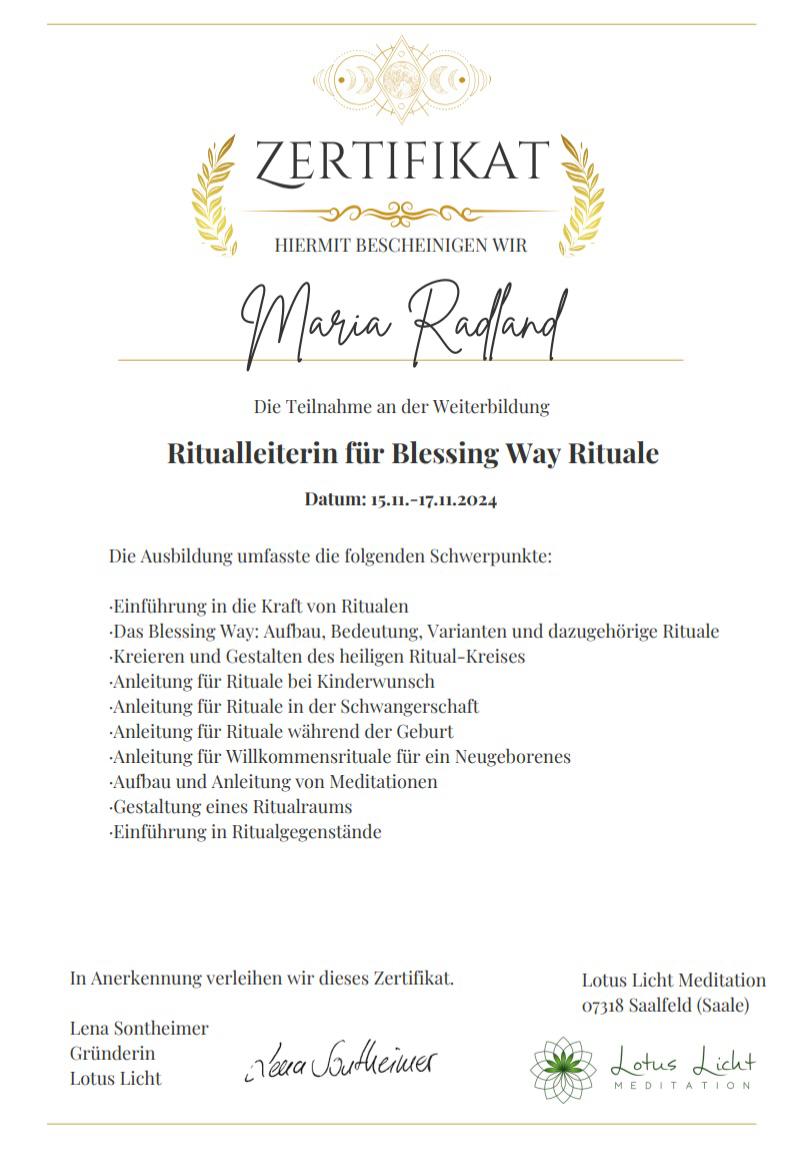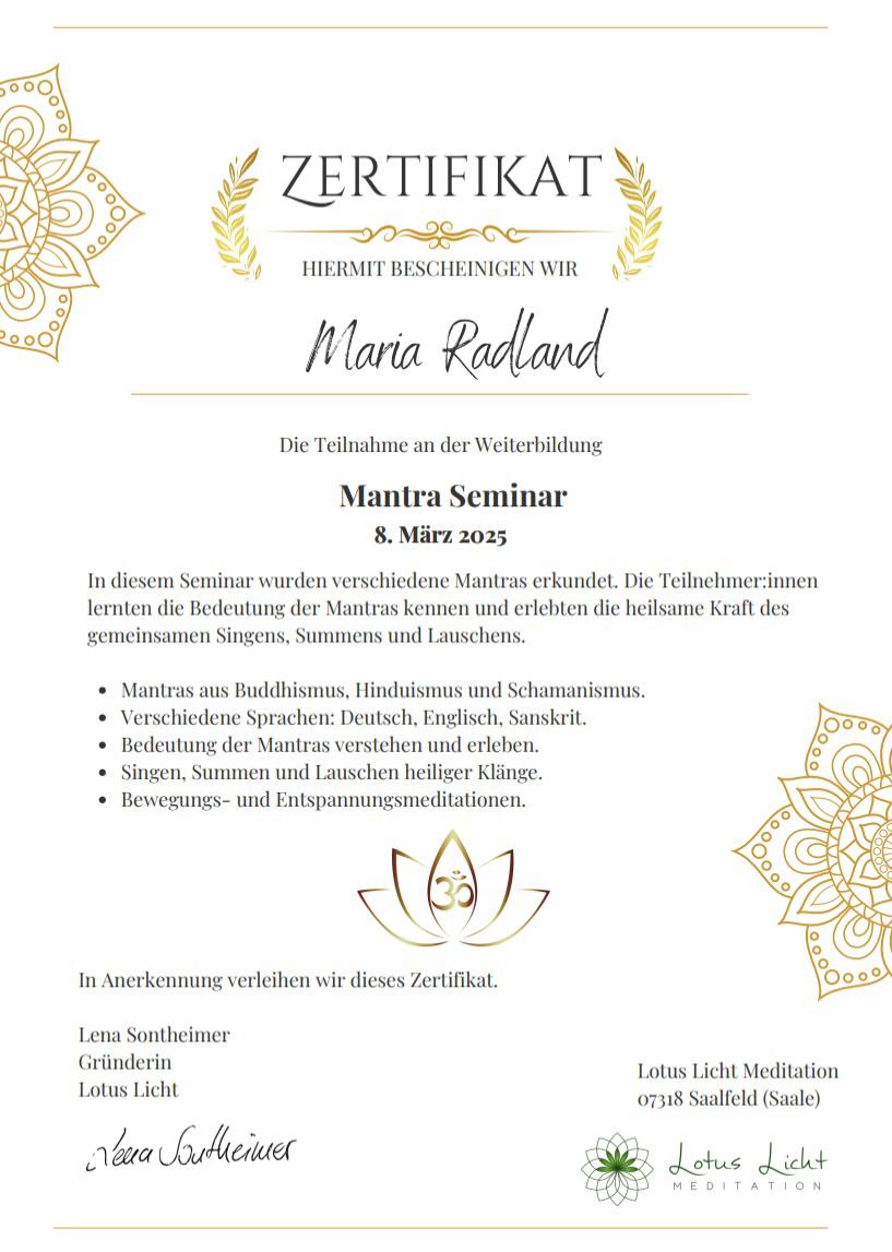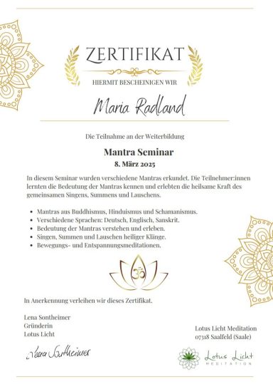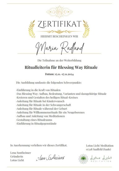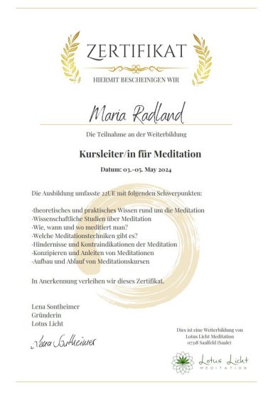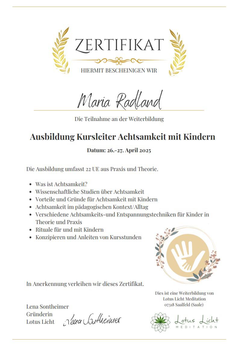 Staatlich anerkannte Sozialassistentin, Kursleiterin für Meditation, Achtsamkeit mit Kindern, Eltern-Kind-Waldspielgruppe, Frauenkreise, Babysteps- und Maxistepskurse. In den letzten Jahren habe ich viele Weiterbildungen und Seminare besucht. Unten findet ihr die genaueren Bezeichnungen und Zertifizierungen.
